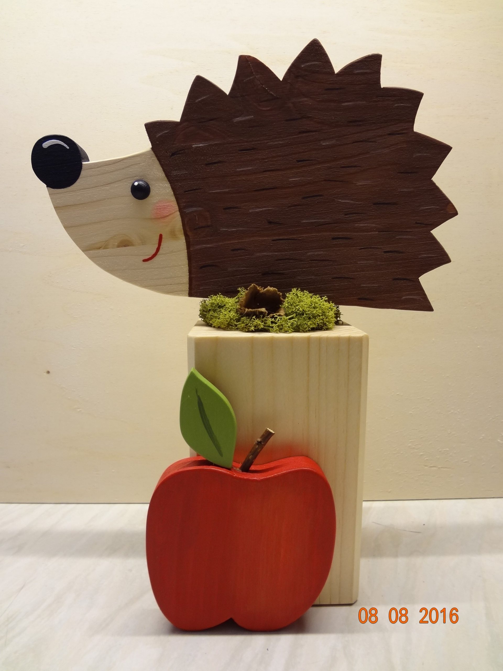 Der Igel ist aus 18 mm Fichte-Leimholz und der Apfel aus 12 mm Pappelsperrholz gefertigt, das Blatt aus 8 mm Pappelsperrholz. Alles ist mit Acrylfarben bemalt. Die Holzsäule (Fichte gehobelt) ist Natur belassen. Die Augen sind aus Plastik-Halbperlen, was das Ganze lebendiger macht. Der Apfel ist mit der Säule fest verleimt. Der Igel ist mit einem Buchenrundstab in der Säule fest verleimt. Wetterfest lackiert mit Seidenmatt-Lack-Spray auf Acrylbasis.