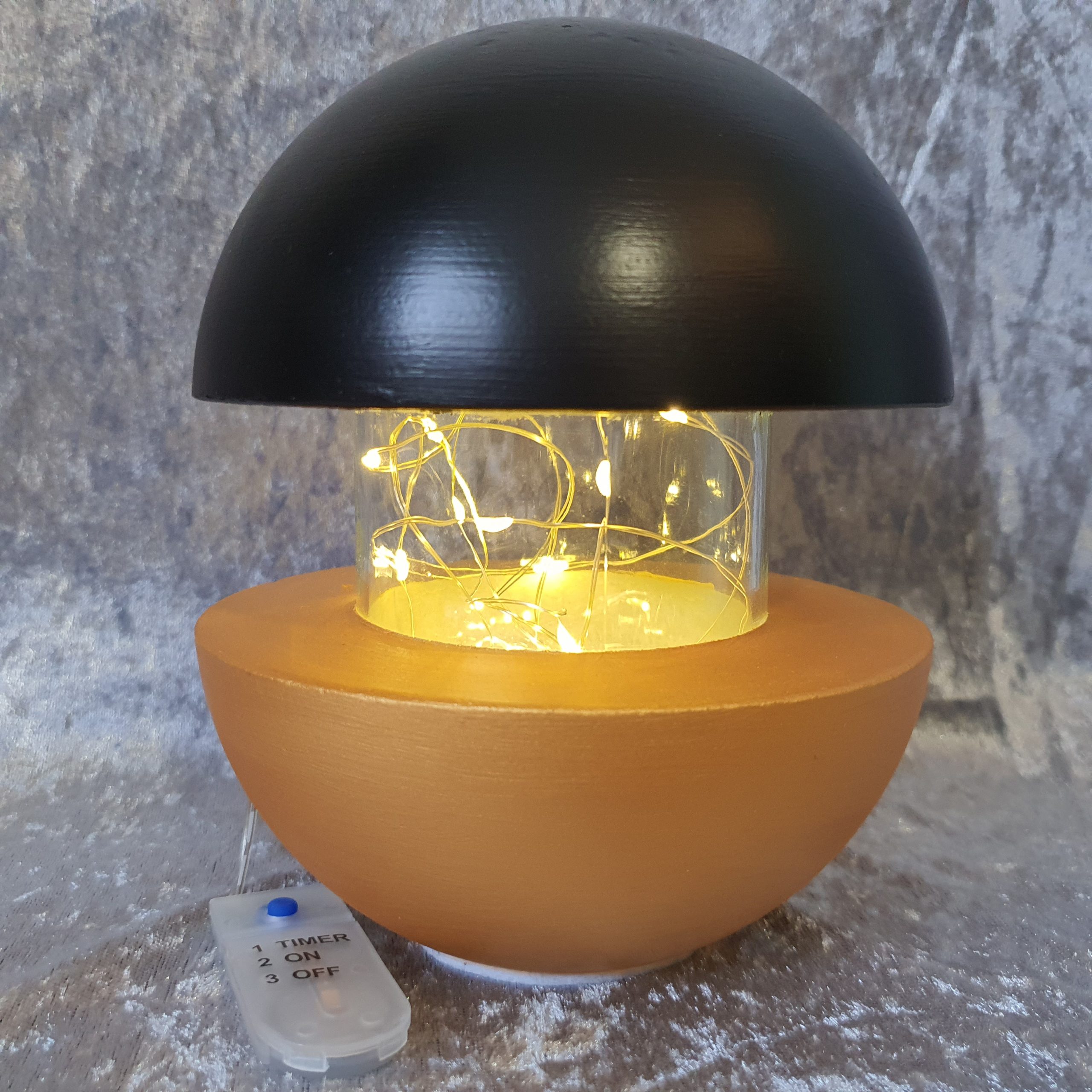 Die LED Leuchte besteht aus massivem, feinem hochwertigen Beton mit einem darin integrierten Glaskörper. Sie ist mit wetterfestem Acryllack seidenglanz in schwarz-gold lackiert. Zum Möbel schonen ist die Standfläche mit Möbelfilz beklebt.