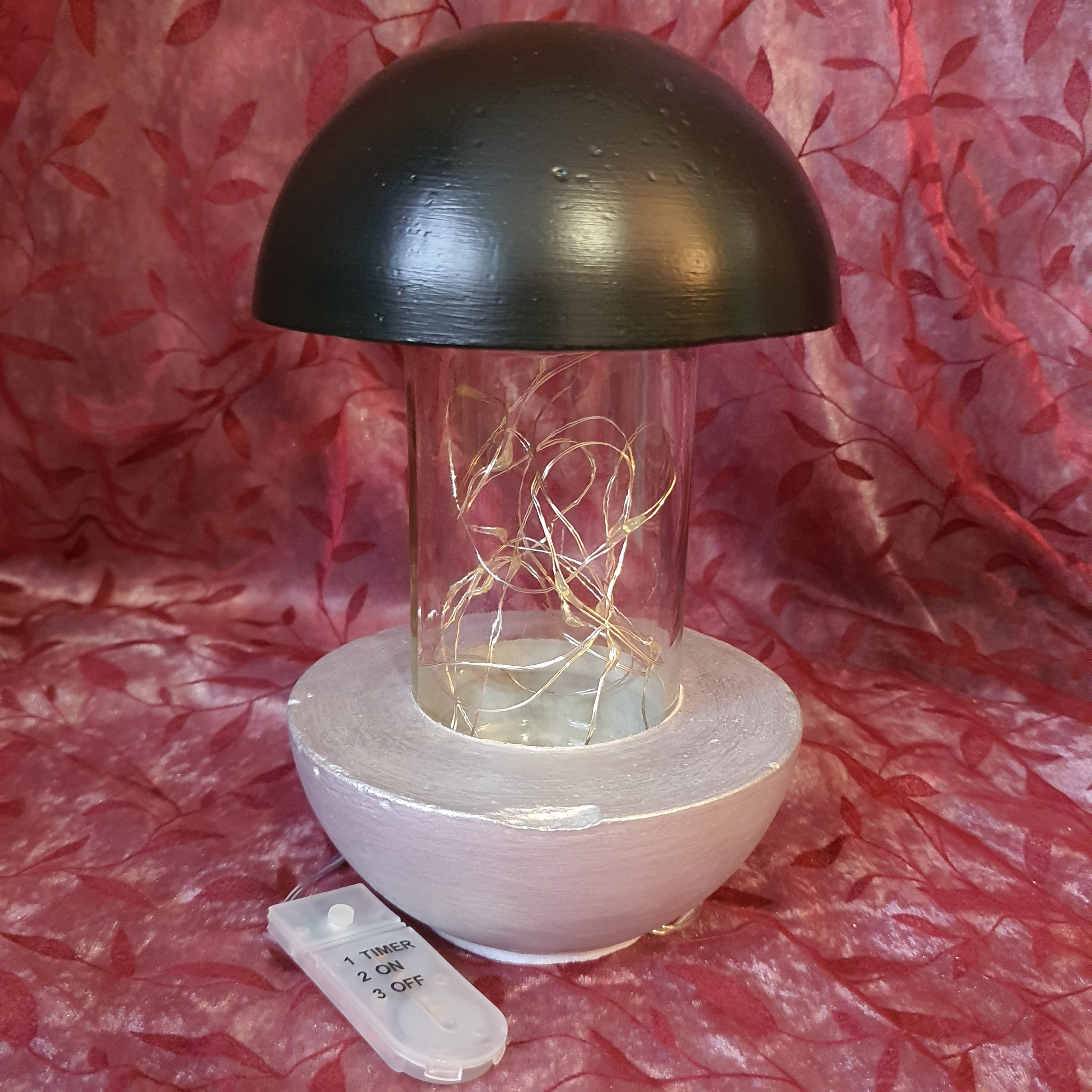 Die LED Leuchte besteht aus massivem, feinem hochwertigen Beton mit einem darin integrierten Glaskörper. Sie ist mit wetterfestem Acryllack seidenglanz in schwarz-silber lackiert. Zum Möbel schonen ist die Standfläche mit Möbelfilz beklebt.