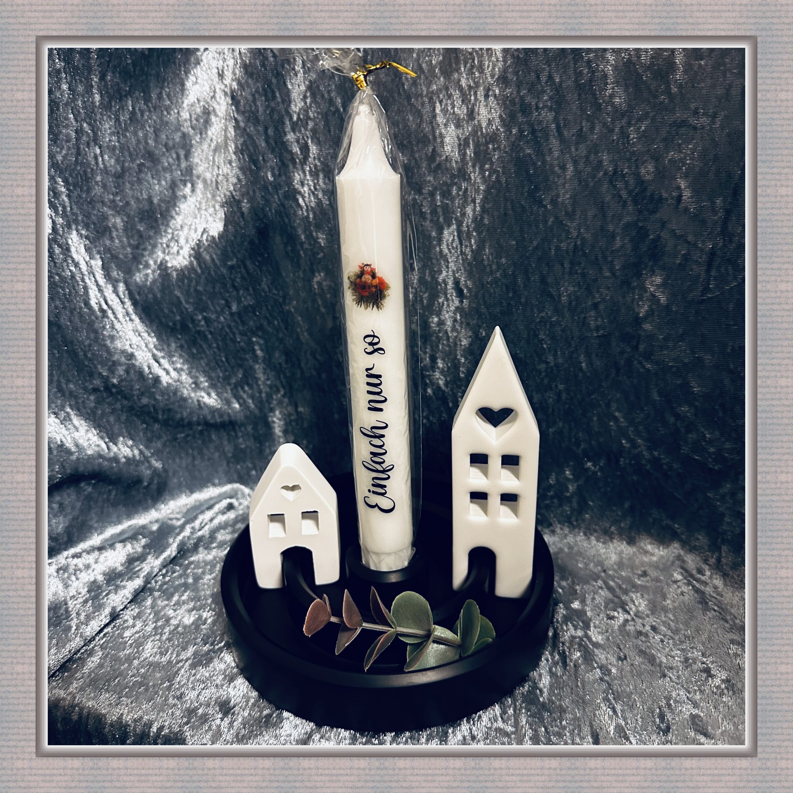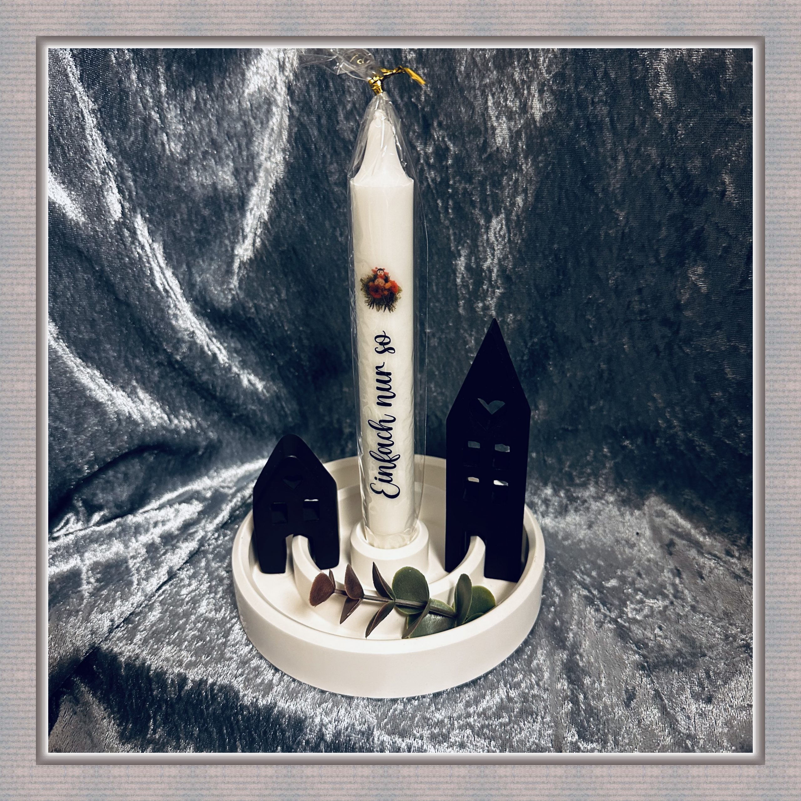 Die Schale ist aus Raysin 250 Black ( eine schwarze Figurengießmasse mit sehr hoher Festigkeit und einer relativ glatten Oberfläche) gegossen und mit Wachs versiegelt. Die Häuser sind aus Keraflott. Die Kerze ist mit Wasserschiebefolie verziert.