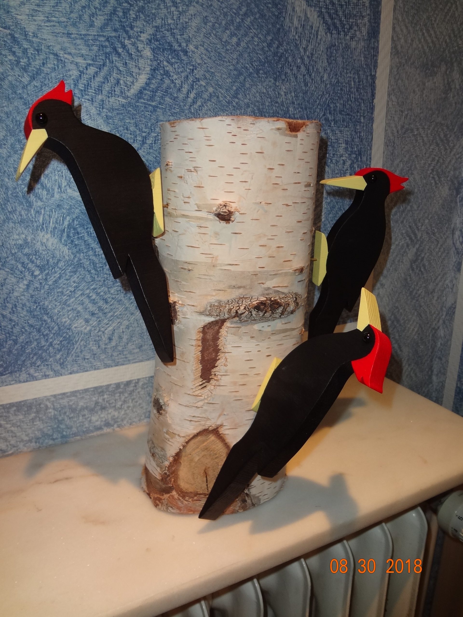 Die Spechte sind aus 18 mm Fichte-Leimholz gefertigt und mit Acrylfarben bemalt. Die Augen sind aus Plastik-Halbperlen, was das Ganze lebendiger macht. Wetterfest lackiert mit Seidenmatt-Lack-Spray auf Acrylbasis.